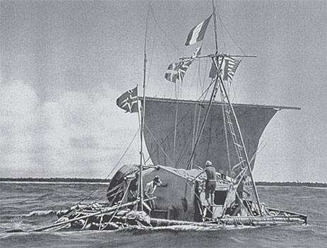 «…28 апреля 1947 года история судоходства, казалось, вновь возвратилась к своему исходному рубежу, – пишет в своей книге «Люди, корабли, океаны» известный немецкий историк Хельмут Ханке. – Тысячи людей, собравшихся на набережной в Кальяо – порту перуанской столицы Лимы, – видели, как буксир тащил мимо причалов несколько больших, связанных между собой древесных стволов. На них поверх горы бананов, мешков и ящиков восседал молодой белокурый человек, державший в руках клетку с попугаем. То был Тур Хейердал – капитан команды плота, состоявшей из пяти человек.