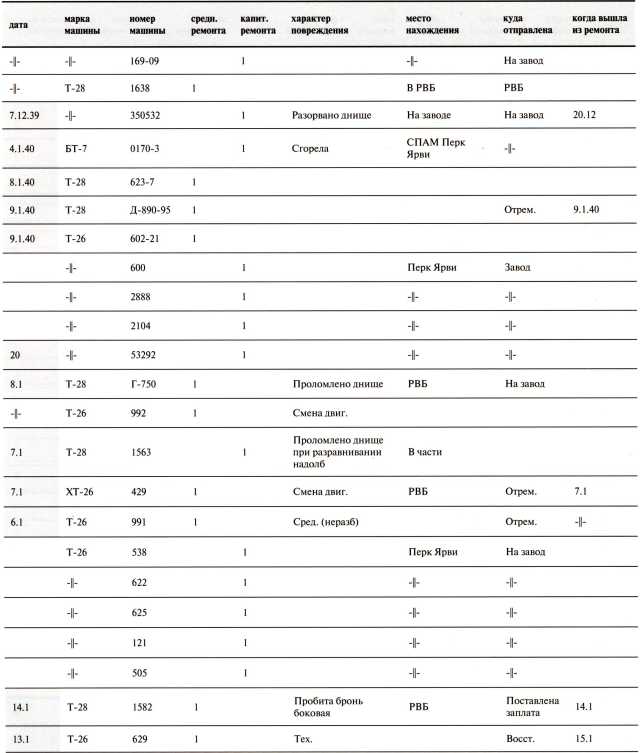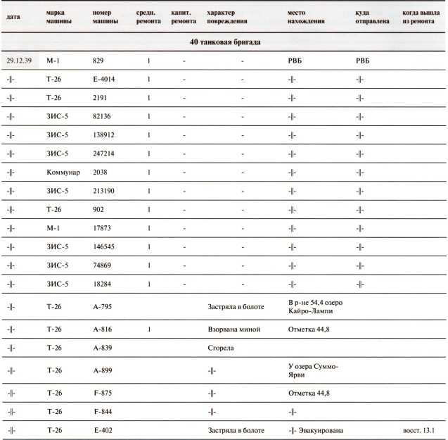 Потери 40-й легкотанковой бригады за декабрь 1939 года