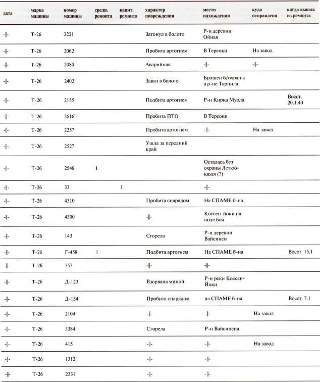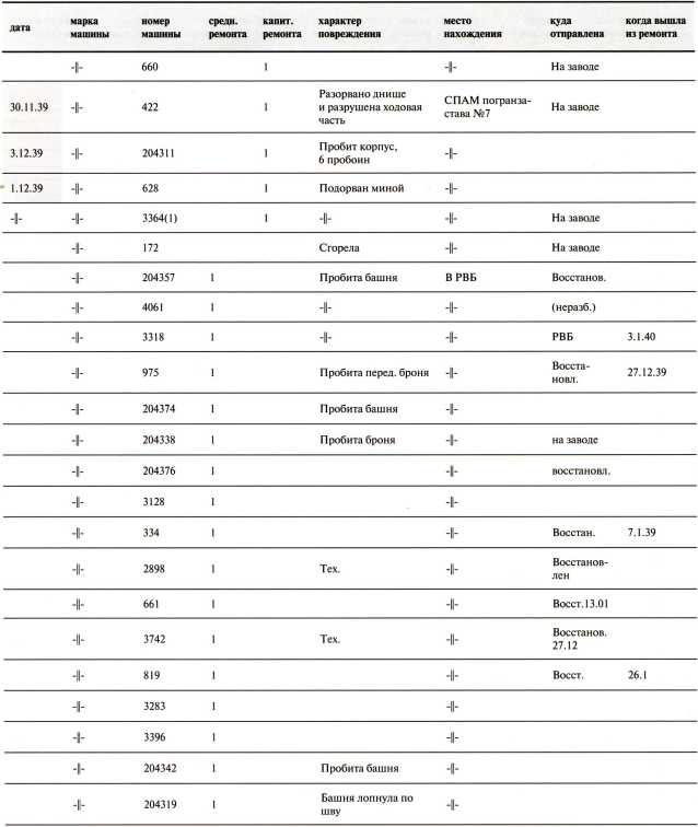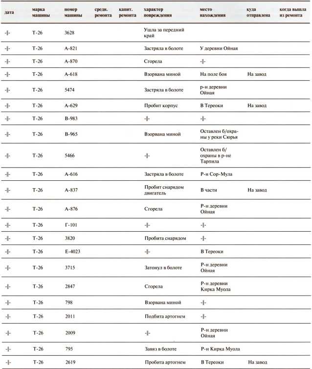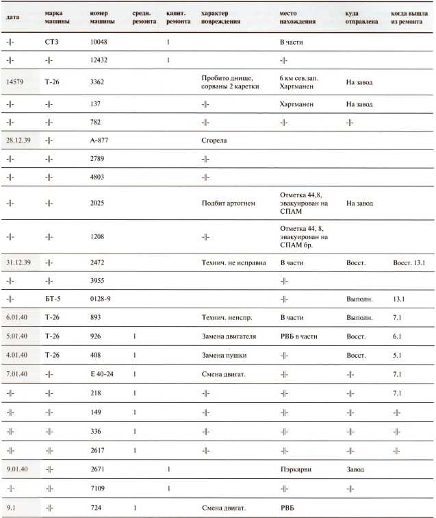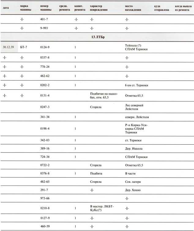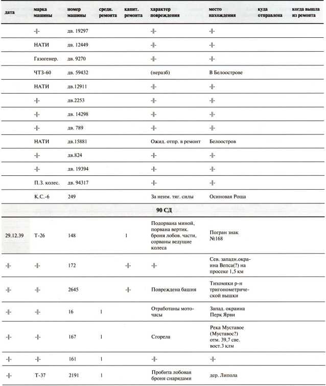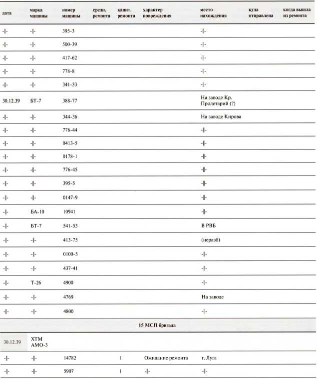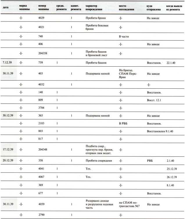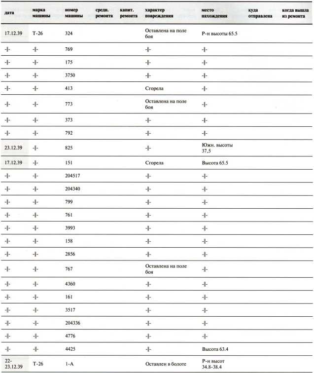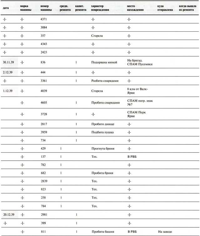 Ведомость потерь бронетанковых частей 7-й Армии на Карельском перешейке в декабре 1939 года