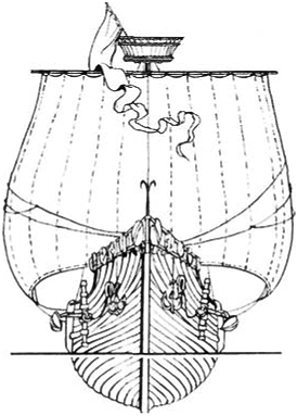 Грузоподъемность такого корабля немного превышала 200 т. Галс-клампы[25], облицованные прочным деревом, служили для проводки галсов, которые представляли собой прочные тросы, в отличие от шкота[26] не имевшие талей[27]. Штаги и многочисленные снасти такелажа отнесены были далеко в корму.