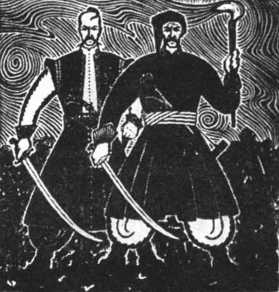 Представляет интерес то, что гайдамаки перед восстанием проводили обряд освящения этих ножей-колунов, для «большого праздника», как написал Т. Шевченко, что указывает на существование определенных тайных обрядов и ритуалов, направленных на уничтожение врагов не только физически, но и духовно, идеологически. Название одного из тайных обществ, которое действовало в Саноцкой и Перемышльской землях в середине XVIII в., было «Спысаки». Но название происходит не от того, что основным их оружием были короткие пики[24], а от инициативной роли этих пик в идеологии общества. Так же товарищество «борцов», которое действовало на Буковине, объединяло мастеров старинной арийской борьбы, которая передавалась из поколения к поколению, ведь есть упоминание об отдельных «борцовских семьях». Профессиональные борцы, которые ходили по деревням и городкам, занимаясь борьбой за деньги и обучением людей, существовали у многих народов. Иван Поддубный был из рода таких «борцов». Кстати, Б. Хмельницкий, обращаясь к обществу левенцев, называл их «народными бойцами», что подтверждает мысль о том, что они также ходили и боролись по деревням.