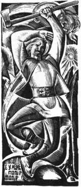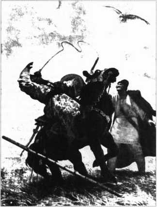Алексей Попович побеждает Тугарина Змеевича, переодевшись калекой. Рисунок Е. Кибрика.