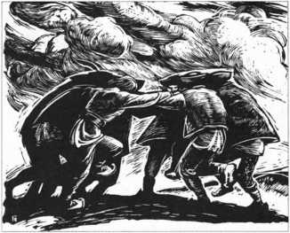Илья Моровец идет в разведку, переодевшись калекой. Рисунок Е. Кибрика.
