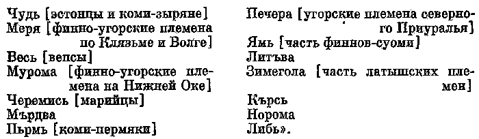 Летописец Нестор в своем знаменитом введении к истории Руси перечислил все славянские союзы племен, вошедшие в Русь, а затем дал перечень иноязычных народов. Каждая единица в этом перечне, очевидно, тоже обозначает устойчивый союз нескольких племен.