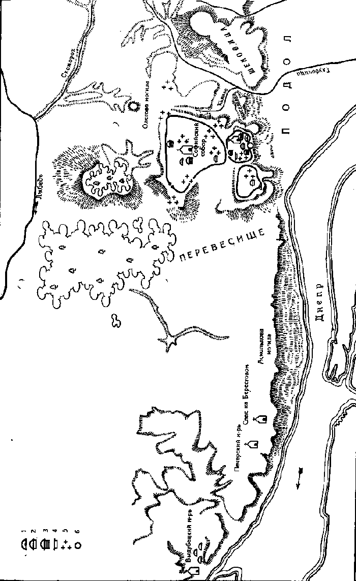 1 — курганные погребения с трупосожжением IX–X в в.; 2 — курганные погребения с трупосожжением в грунтовой могиле IX–X вв.; 3 — погребения в срубных гробницах IX–X вв.; 4 — погребения в грунтовых могилах конца X — начала XI в.; 5 — церковные кладбища XI–XII вв.; 6 — братские могилы XIII в.
