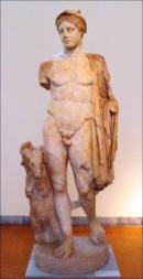 Гермес в хламиде и крылатом петасосе (древнегреческой шапочке). Правой рукой он держит за рога барана. II в. н. э. копия с оригинала конца 5 в. до н. э.