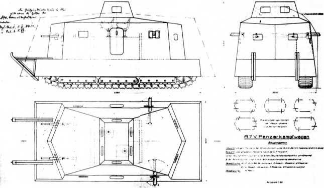 Эскизный проект установки на шасси A7V полноразмерного бронекорпуса и вооружения в составе 77-мм штурмовой пушки, двух 20-мм автоматических пушек Беккера и четырех 7,92-мм пулеметов МG.08. Обратим внимание на противоположно установленные сидения в овальной рубке.