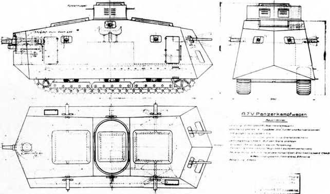 При этом количество забронированных шасси OHL поначалу было ограничено десятью. Машина получила обозначение A7V — по аббревиатуре занимавшегося ею подразделения военного министерства. Иногда в литературе буква «V» в аббревиатуре A7V ошибочно расшифровывалась как «конструкция Фольмера» («bauart Vollmer»). Шасси получали номера от «500» и далее, под которыми и числились впоследствии машины. Любопытно, что сведения об этих работах вскоре стали известны русской разведке. В приказе Командующего войсками Юго-Западного фронта генерала А.А. Брусилова № 0234 от 8 января 1917 г. указывалось: «Есть сведения на то, что германцы уже построили два типа „тэнк“: один низкий, вооруженный пулеметами, другой большого типа, размером железнодорожного вагона с пулеметами и приспособлением для выпуска ядовитых газов. Приказываю предупредить всех без исключения нижних чинов о возможности появления неприятельских „тэнков“ и объяснить доступным им языком их устройство, дабы выход этих чудовищ современной техники не мог бы быть для войск неожиданным». На самом деле, в это время еще только велась сборка деревянного макета тяжелого танка, а опытный легкий пулеметный танк германцы построят только через год. В середине февраля 1917 г. русское командование сообщило союзникам «тревожные сведения» о планах строительства танков в Германии, причем в сообщении указывалось: «Оборона против танков — наиболее эффективен наблюдаемый прицельный огонь на больших дальностях бронебойными снарядами. Также применимы концентрация артиллерийского огня вдоль дорог, интенсивный пулеметный огонь и глубокие ямы». Как показали события, готовность и возможности Германии по производству танков были переоценены. А вот меры противотанковой обороны союзники на Западном фронте заранее все же не подготовили. С другой стороны, 16 апреля 1917 г. на р. Эн у Шмен-де-Дам впервые вышли в бой французские средние танки «Шнейдер» и «Сен-Шамон», и хотя их первый боевой опыт был неудачен, германскому военному руководству следовало считаться с тем, что новое боевое средство появилось и у французов. И ускорять работы над собственным проектом танка.
