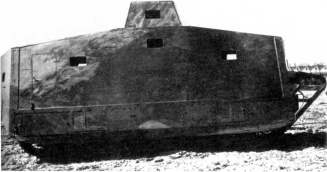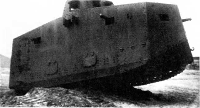 Испытания танка A7V на шасси № 501 в варианте «пулеметного». Обратим внимание на бронирование ходовой части, отсутствие защиты кожухов пулеметов и выводов выхлопных труб, открытые буксирные крюки.