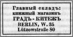 Книги «Медного всадника», так же как и другие издания БРП, распространял книжный магазин и издательство «Град Китеж», монархического направления. Склад располагался по адресу «книжный магазин "Grad Kitesch”», Berlin W 35, Lutzowstr. 80. С. А. Соколов в переписке жаловался на владелицу магазина, которая после его разорения стала шантажировать, что выдаст склад БРП большевикам342. Скорее всего, Брат № 1 имел в виду не супругу второго владельца «Града Китежа» Владимира Васильевича Домо-жирова, а Марию Веревкину-Шелюто, жену Антона Веревкина-Шелюто.