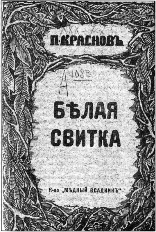 Наибольший интерес в свете рассматриваемой темы имеет последняя книга П.Н. Краснова, вышедшая в издательстве «Медный всадник», — «Белая Свитка» (366 с., типография «Зинабург и К°»). Она должна была начинать намечаемый цикл «От Красного знамени к Двуглавому Орлу» и была посвящена деятельности БРП351. Автор в личной переписке неоднократно подчеркивал, что материалом для работы послужили подлинные протоколы польской политической полиции.
