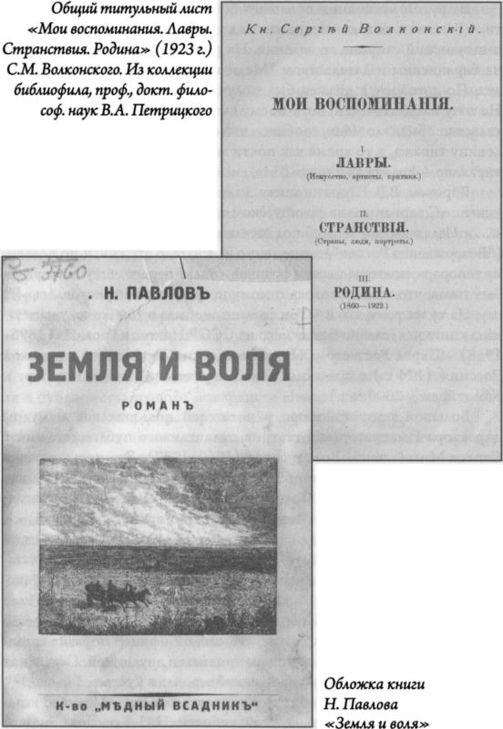 Большой популярностью у читателей пользовались мемуары директора Императорских театров, талантливого публициста князя Сергея Михайловича Волконского (1860–1937). Его неоднократно переиздававшиеся трехтомные «Мои воспоминания» впервые вышли в 1923 г. тиражом 4000 экз. Они были оформлены в двух книгах: первые два тома вместе («Лавры (Искусство, артисты, критика)» и «Странствия (Страны, люди, портреты)») (349 с.), а третий — отдельно («Родина (1860–1922)») (342 с.). Третья часть была напечатана в типографии Р. Ольденбурга тиражом 4000 экз. Казалось бы, чисто театральные мемуары дореволюционной России, но одна из глав посвящена… П.Н. Врангелю, которого мемуарист встретил еще до Первой мировой войны и которого молодой офицер поразил своим высоким интеллектом, культурным уровнем и эрудицией. Случайная встреча… или типичный политический «рояль в кустах»?