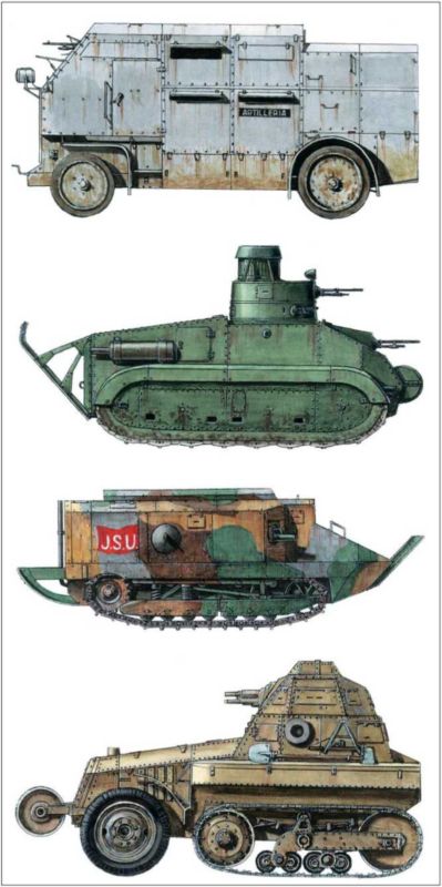 Чаще всего это были кустарные БА, бронированные «котельным железом», безбашенные, с амбразурами для стрельбы из ручного оружия.