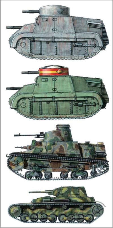 Также испанцы получали танки из Франции. Вначале это были танки «Шнейдер» CAI, поступившие в Испанию после Первой мировой войны, а затем и знаменитые «Рено» FT-17, поставляющиеся с пулеметным и пушечным вооружением, в литых и клепанных башнях. Получила испанская армия и танки управления — FT-17TSF, с радиостанцией в рубке корпуса. Испанцы относились к этим машинам бережно, поэтому до роковой схватки сумели дожить даже такие танки, как «Шнейдер».