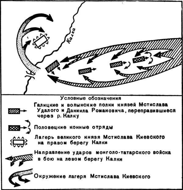 К тому же на княжеском совете выявились разногласия относительно плана дальнейших действий. Мстислав Киевский считал, что переходить Калку и нападать на монголов в поле опасно. Он расположился на правом высоком берегу Калки и начал строить укрепленный лагерь. Мстислав Галицкий и другие князья были за немедленное наступление. Вместе с половецкими отрядами они перешли на левый берег реки Калки и были сразу атакованы монгольской конницей.