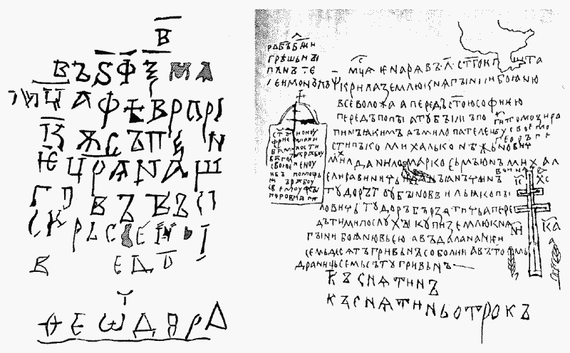 Надписи-граффити на стенах киевского Софийского собора о смерти «цесаря нашего» Ярослава Мудрого 20 февраля 1054 года и купчая запись на землю Бояна в начале XII века. Вполне возможно, современные украинские историки считают их сделанными «погаными москалями», проникшими в столицу незалежной Украины