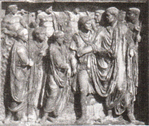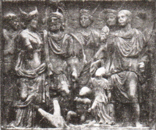 1. Рельеф арки Траяна в Беневенте. Беневенто. Библиография по поводу этой арки содержится в примеч. 6 к гл. VIII, здесь же укажем только С. Рейнаха (Reinach S. Rep. d. rel. I) (наш рельеф приведен у него на с. 65, 1). В указанном примечании я даю общие пояснения к рельефу на арке.
