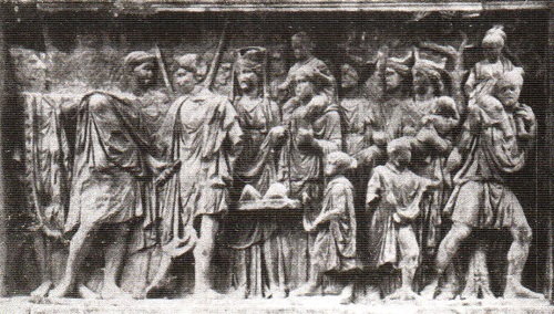 Императора торжественно приветствует группа из четырех мужчин и двух женщин. Женщины представляют собой символические фигуры, на них — короны-венцы, и они несомненно олицетворяют четыре итальянских города; у одной на руках младенец. Оба мужчины — римские граждане; у каждого на плечах маленький мальчик и мальчик постарше — рядом. В углу справа — деревья. Поскольку этот рельеф украшает внутреннюю поверхность арки и поскольку другой рельеф, расположенный там же, посвящен городу Беневенту, то наш рельеф, скорее всего, олицетворяет благодарность, которую четыре североиталийских города — и среди них Беневент — испытывают к Траяну за учреждение им alimenta. В Италии теперь рождается больше детей — и все благодаря alimenta. Такова основная идея изображения на рельефе.