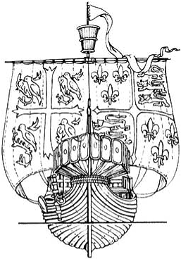 Корабль, относящийся к классу коггов. Изображение обнаружено на печати графа Эд. Рутланда (1395). По оконечностям корабля установлены касли (замки). Эти площадки-платформы закрывались высоким фальшбортом, по традиции выполненным в виде ряда щитов. Для наблюдателей и лучников на мачте крепилась бочкообразная марсовая площадка. Навесной кормовой руль, большой прямой парус с гербами города и владельца и прочная мачта, составленная из нескольких брусьев, стянутых канатами, подчеркивали добротность корабля. Когги были достаточно мореходными судами. Короткий бушприт[33] использовался для проводки булиней[34], оттягивающих наветренную шкаторину[35] паруса.