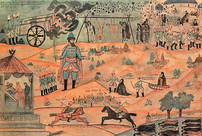 Расправа над соловецкими монахами: «…Повесити овыя [иных] за выю, овыя же и множайшия междеребрия острым железом прорезавше, и крюком продевшим на нем повесити, каждаго на своем крюке… Иныя же от отец [из отцов] зверосердечный мучитель за ноги вервию оцепивше к конским хвостом привязати повеле безмилостивно, и по отоку влачити, дондеже души испустят сии». Старообрядческий лубок