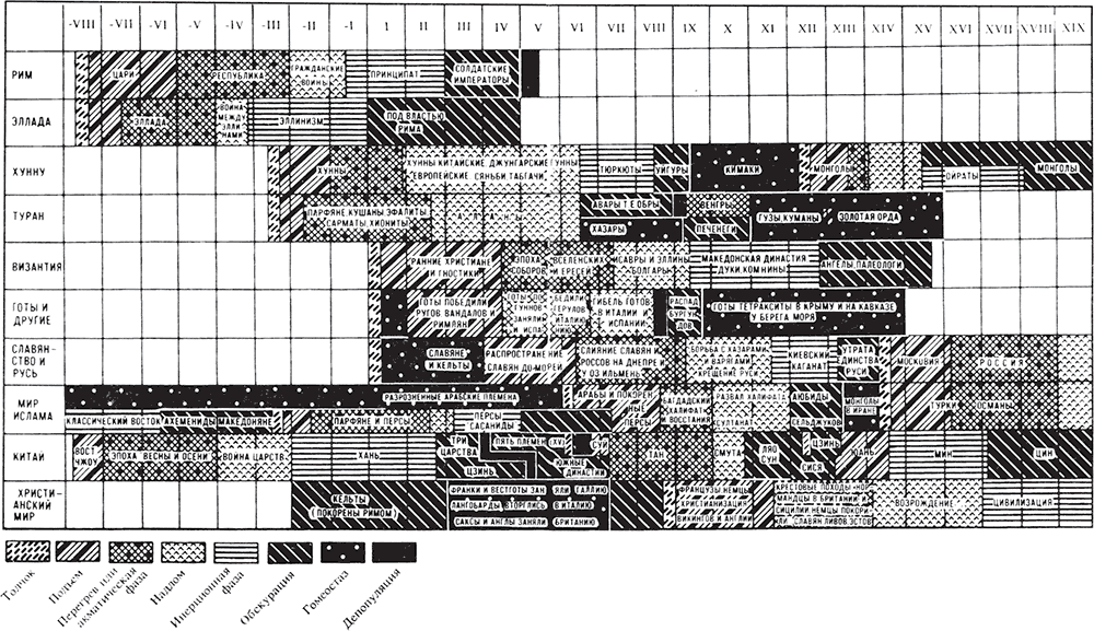 Коль скоро так, а это действительно так, то можно свести все фазы этногенеза с учетом времени и места (эпохи и региона) на одну таблицу, каковую мы и сделали для Северного полушария Старого Света.