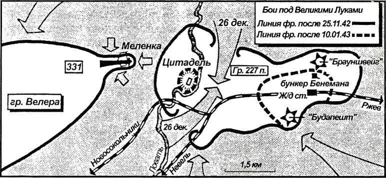 Генерал Пуркаев атаковал город тремя дивизиями. Три дивизии против одного полка. Русские обошли Великие Луки с севера и юга, через цепь опорных пунктов 83-й пехотной дивизии, и окружили город. Внутри крепости находилось 7500 немцев под командованием подполковника фон Сасса, оборонявших линию фронта в двадцать один километр: гранатометчики, артиллеристы, саперы, хозяйственные и медицинские части 83-й пехотной дивизии. Они были усилены, или просто к ним присоединились, оказавшиеся внутри «крепости» после отступления следующие части: железнодорожники, строители, части 3-го полка реактивных минометов «Небельверфер»; 17-й легкий разведывательный батальон; немецкий батальон самообороны; батальон эстонских добровольцев, сформированный из эстонцев, основная часть которых во время боя группой перешла из Красной Армии; три роты 286-го зенитного дивизиона; рота легких зенитных орудий и 2-я рота тяжелых минометов 736-го артиллерийского дивизиона армии; 3-й дивизион 183-го артиллерийского полка и части 70-го моторизованного артиллерийского полка. Миниатюрный Сталинград.