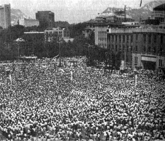 Рис. 40. Одно из «собраний граждан 10 июня» (1987) — перед зданием Сеульской мэрии, в день похорон погибшего из-за полицейского беспредела студента Ли Ханёля.