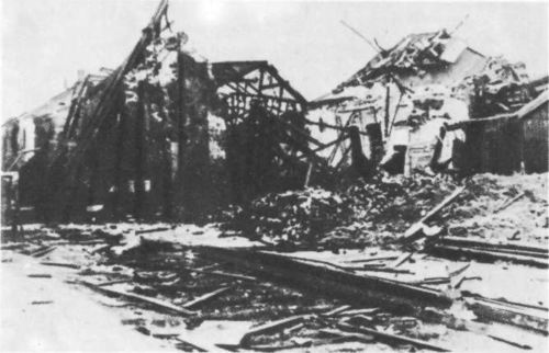 Один из цехов Львовского паровозо-вагоноремонтного завода, разрушенного гитлеровцами.