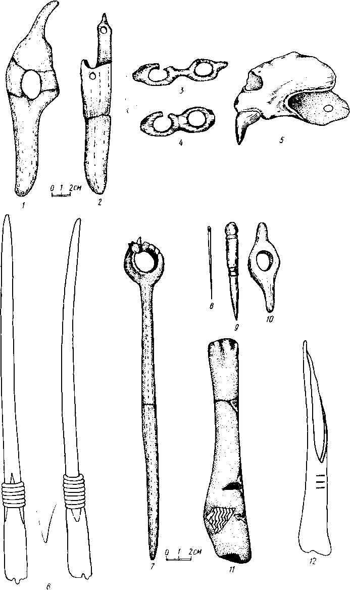 1, 2, 9, 10 — вироби невизначеного призначення; 3, 4 — застібки; 5 — підвіска з фрагменту щелепи ведмедя; 6 — реконструкція кріплення кістяного наконечника списа; 7 — булавка зі стилізованою головкою; 8 — голка; 11 — стилізоване зображення жінки; 12 — проколка.