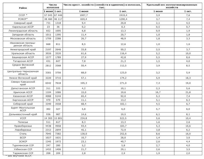 …Так что на самом деле никакого рывка той осенью еще не было. Вместо молекулярной коллективизации началась гнездовая, только и всего. В целом по стране ее процент поднялся с 3,9 до 7,6 % затронула она в основном зерновые районы на юге, юго-востоке и востоке европейской части страны – ради чего, собственно, и проводилась. Уровень коллективизации там был от 16 до 25 % в других сельскохозяйственных районах – ниже (5,5–7,5 %) и совсем низким – в потребляющей полосе, сельское население которой являлось основным кадровым резервом для промышленности, так что спешить тут особенно было некуда.