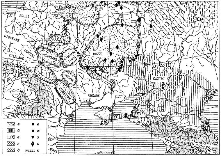 a — археологические ареалы славян; б — территория салтово-маяцкой культуры; в — ареал волжских болгар; г — муромы; д — мордвы; е — хазарские крепости, выстроенные византийскими мастерами в 830-х гг.; ж — хазарские городища, на которых византийскими строителями в те же годы были воздвигнуты каменные фортификации; з — прочие крепости Хазарского каганата; и — места находок пяти-семилучевых височных колец (четвертой группы по Е.А. Шинакову); к — этнонимы «Баварского географа» (по Седову В. В.)