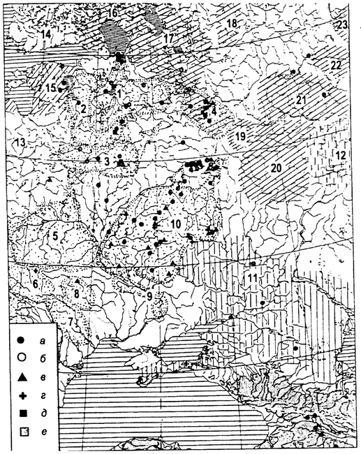 1–10 — регионы славянских ллемеякых образований: 1-словен ильменских, 2- кривичей псковских, 3 — кривичей смоленско-польских, 4 — мери, 5 — булевской группы (вольшяне, древляне, поляне, дреговичи), 6 — хорватов, 7 — тиверцев, 8 — бужан, 9 — уличей, 10 — русов — носителей вольшцевской и эволюционировавших на ее основе культур; 11 — территория салтово- маяцкой культуры (Хазарскогокаганата); 12 — область волжских болгар; 13 — летто-литовских племен; 14–23 — регионы финно-угорских племен: 14 — сумииеми, 15-эстовиливов, 16 — корелов, 17 — веси, 18 — заволочской чуди, 19 — муры, 20 — мордвы, 21 — мари, 22 — удмуртов, 23 — коми-пермяков.
