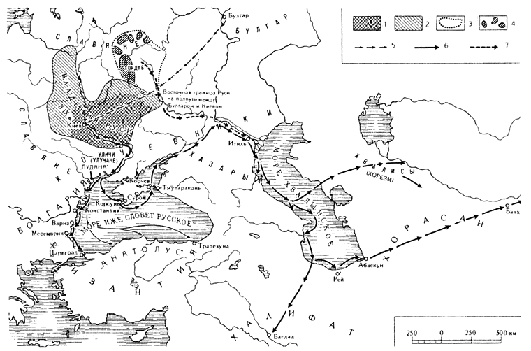 1 — ядро русского союза племен (поляне, русы, север) в VI–VII вв.; 2 — владения Руси начала IX в.; 3 — племенной союз вятичей (по данным курганов X–XIII вв.); 4 — локальные варианты археологических данных у вятичей (племена); 5 — путь восточных купцов из Булгара в Киев в IX в.; 6 — пути сбыта полюдья Киевской Русью в IX–X вв.; 7 — предполагаемый путь сбыта полюдья вятичами в IX в.