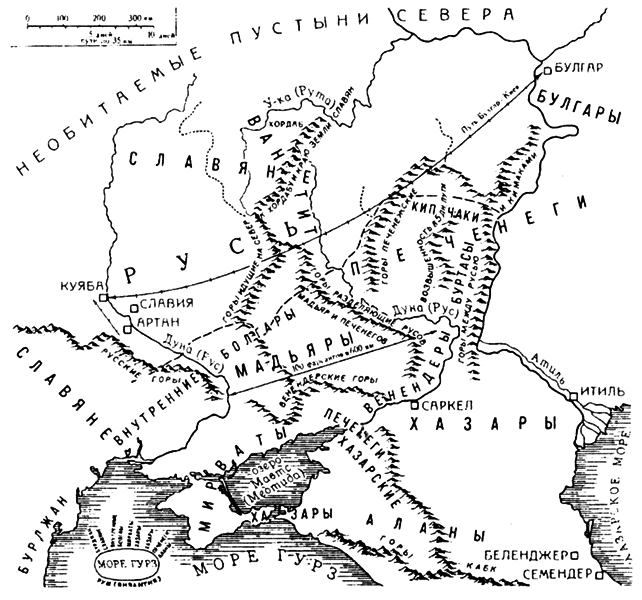 Рис. 17. Русь и сопредельные ей народы по данным арабских источников (по Рыбакову Б. А.)