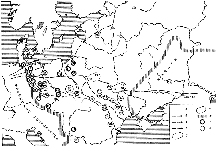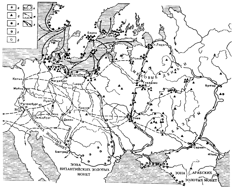 Рис. 19. Обращение арабского серебра в Европе (по Херрману И.) а, б, в, г, д, е — находки различных денег; ж — сухопутные пути; з — водные пути
