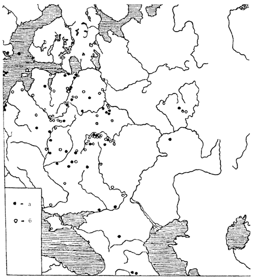 Рис. 20. Клады куфических монет конца VIII–IX вв. в Восточной Европе (по Иванову А. Г.) а — клады начального пер. обращ. дирхема (до 833 г.), б — клады второго пер. обращ. дирхема (833–900 гг.)