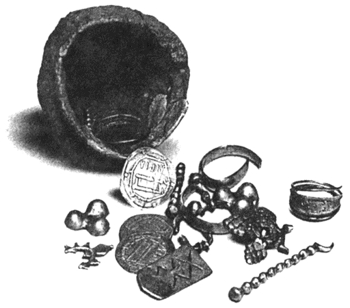 Рис. 23. Клад в горшке. Монеты, украшения. Серебро, глина. Новотроицкое городище. Украина. IX в. Эрмитаж