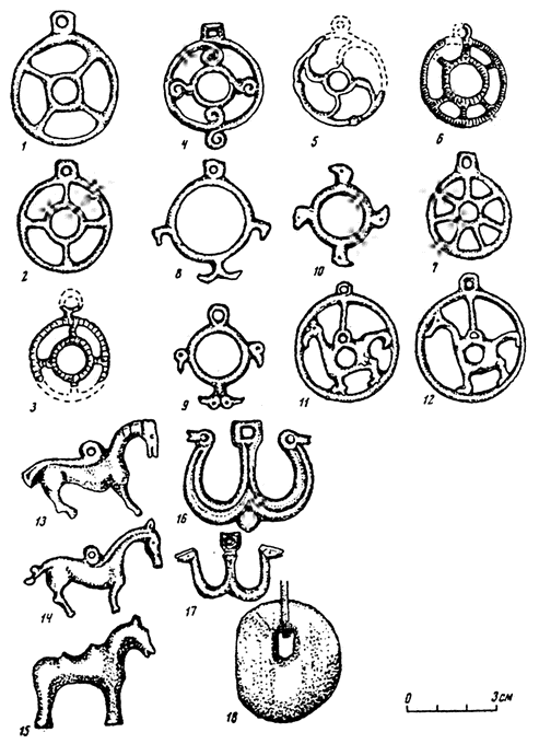 Очень показательны среди древностей русов разнообразные амулеты и украшения. «Амулеты у салтовцев были нескольких видов и все уходили корнями в древние индоиранские верования. Очень часто среди бронзовых оберегов встречаются варианты символической фигуры огня-солнца — “крест в круге”. Лучи в нем иногда имеют вид спиральных завитков, обозначающих движущее солнце. Четыре изогнутых луча — “криволинейная свастика” — тоже символ вращающегося светила. Среди находок имеются и колесообразные фигуры, образованные шестью, семью или восемью лучами. В общепринятой символике, появившейся у индоевропейских народов за три тысячелетия до салтовских русов, обычно было восемь лучей. Но у салтовцев особенно популярным было число “семь”»{102}. (Рис. 24, 25)