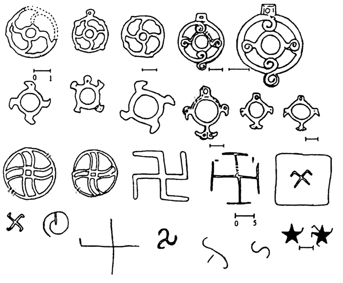 Все это так, но нельзя забывать, что подобные изображения «креста в круге», «криволинейной свастики», многолучевые колесообразные фигуры весьма характерны для кельтов на всем временном отрезке их существования.