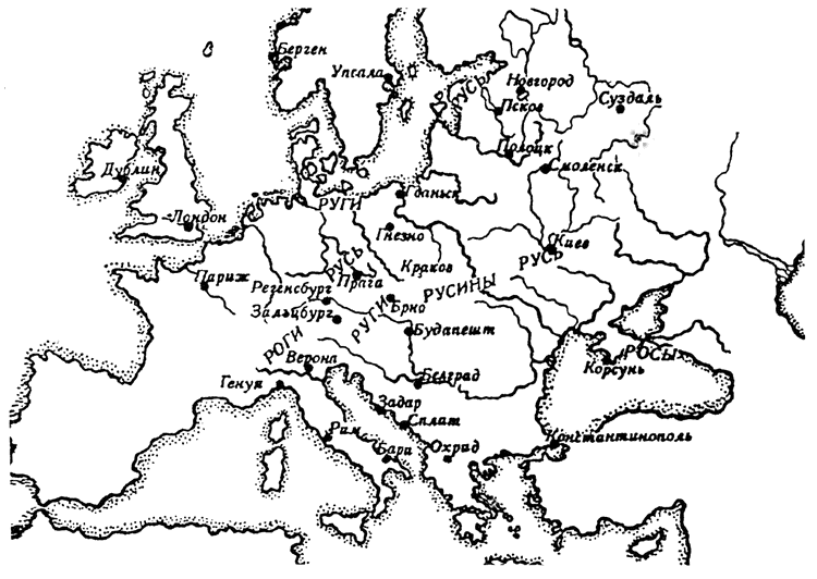 Рис. 26. Руги и русы на карте Европы в VI–XII вв.