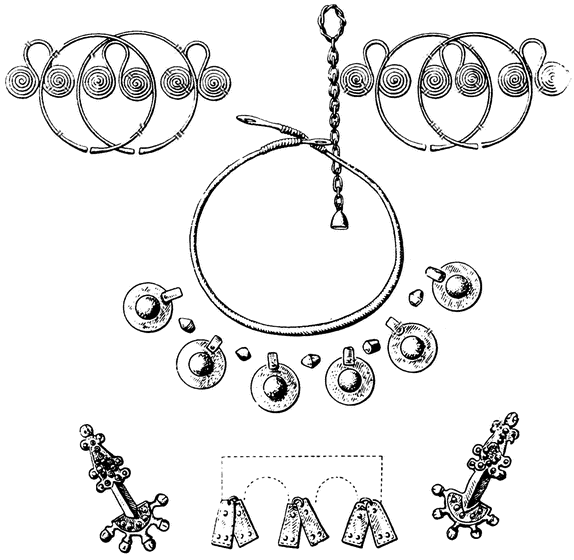 Рис. 22. Гривна, браслет, подвески. Серебро. Клад. Новотроицкое городище. Украина. IX в. Эрмитаж