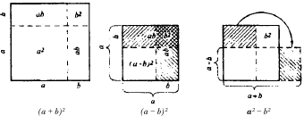 Вы помните, как они выводились? Это было довольно громоздко. А грек со своей привычкой к наглядности доказывал их не вычислением, а чертежом: чертил отрезок А, отрезок В, строил на них квадраты и показывал: «Вот!» Посмотрите и убедитесь.