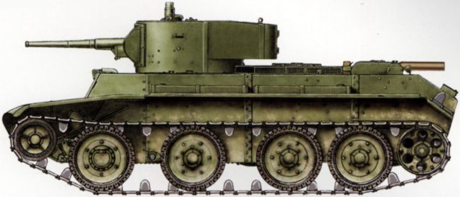 Советский легкий танк БТ-7 обр. 1937 г. Масса — 13,8 т, экипаж — 3 человека, вооружение — 45-мм пушка и 7,62-мм пулемет, бронирование — 22 мм, скорость — 52 км/ч, двигатель — 500 л.с., запас хода — 375 км
