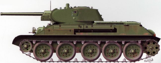 Советский средний танк Т-34 обр. 1941 г. Масса — 28 т, экипаж — 4 человека, вооружение — 76-мм пушка и 2х7,62-мм пулемета, бронирование — 45 мм, скорость — 55 км/ч, двигатель — 500 л.с., запас хода — 300 км