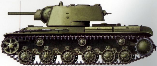 Советский тяжелый танк КВ-1 обр. 1941 г. Масса — 47 т, экипаж — 5 человек, вооружение — 76-мм пушка и 2х7,62-мм пулемета, бронирование — 75 мм, скорость — 34 км/ч, двигатель — 600 л.с., запас хода — 200 км