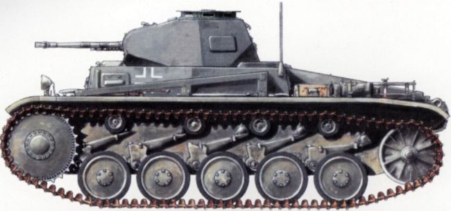 Немецкий легкий танк Pz.IIF. Macca — 9,5 т, экипаж — 3 человека, вооружение — 20-мм пушка и 7,92-мм пулемет, бронирование — до 30 мм, скорость — 40 км/ч, двигатель — 140 л.с., запас хода — 145 км