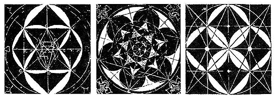 Гравюры Дж. Бруно (?) из его книги «Сто шестьдесят тезисов против… математиков» Слева направо: «Фигура всеединого ума» (figura mentis), «Фигура рассудка» (figura intellectus), «Фигура любви» (figura amoris). Прага, 1588.