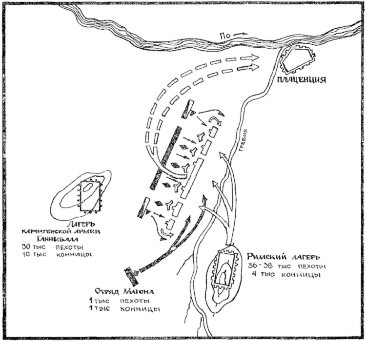 В небольших стычках с римлянами пунийцы умышленно дали возможность Семпронию добиться нескольких незначительных побед, чтобы укрепить его уверенность в победе и на поле большого, решающего боя. Отмахнувшись от советов Сципиона, Семпроний начал сражение на месте, выбранном Ганнибалом и, конечно же, удобном прежде всего для его войска. Римский консул не учел этого, и его ошибка оказалась роковой.
