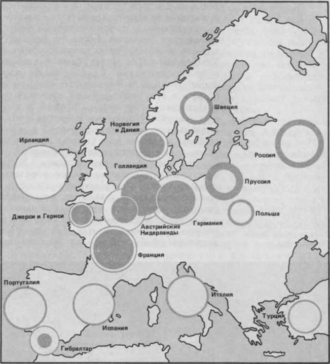 По данным сводки английских статистических документов (А.Е., М. et D., Angleterre 10, f° 130). Импорт превышает или не превышает экспорт в соответствии с тем, белым или черным цветом закрашены центральные части кругов, изображающих импорт (И) и экспорт (Э). Круги, представляющиеся пустыми, говорят о равновесии между И и Э: в Турции И = 290 559, Э = 273 715; в Италии соответственно 1009 тыс. и 963 263; в Ирландии — 2 622 733 и 2370866. Неуравновешенность к выгоде Англии: американские Штаты, Португалия — 977 820 и 754612; Франция после договора Идена — 717034 и 1221 666. Сводный подсчет: для Европы — 11 170 860 и 12813435; для Америки — 5 603947 и 8 159 502; для Азии — 2671547 и 2627887; для Африки — 82917 и 1 367 539. В целом 19 529273 против 24878 362, т. е. положительное сальдо, превышавшее 5 млн.