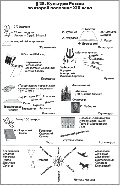 В целом русская культура второй половины XIX в. характеризуется такими чертами, как гражданское достоинство, гуманизм и свободомыслие. Как отмечали знаменитые современники, у нее был «великий голос русского языка» (Толстой, Тургенев, Достоевский и др.), она была одарена прекрасным музыкальным слухом (Чайковский, Римский-Корсаков, Бородин и др.), и «обладала прекрасным художественным зрением» (Репин, Суриков, Крамской и др.).
